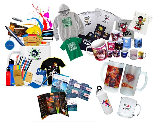 Diseño y publicidad digital e impresa, variedad de artículos estampados personalizados.
